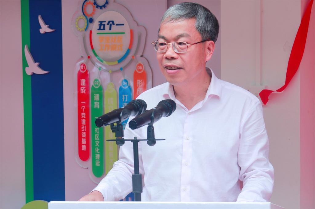 黎贞崇在揭牌仪式讲话,他代表学校党委向材苑“一站式”学生社区的揭牌启用表示热烈祝贺,向为材苑“一站式”学生社区建设付出辛勤劳动的所有师生员工表示衷心感谢。他指出,实施“一站式”学生社区综合管理模式建设,是深入学习贯彻习近平总书记关于教育的重要论述的具体实践,也是全力打通“三全育人”里程、助力学生德智体美劳全面发展的有力举措。学生社区综合管理模式建设有利于更加全面掌握了解学生动态,更好地服务学生成长成才。让社区成为党建引领和业务工作的重要阵地,对于学校管理和学生成长具有重大意义。