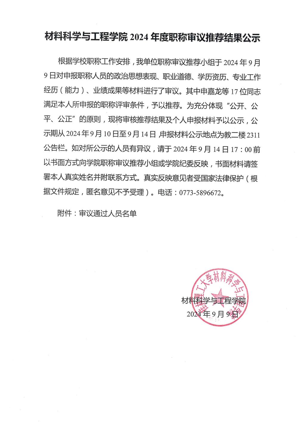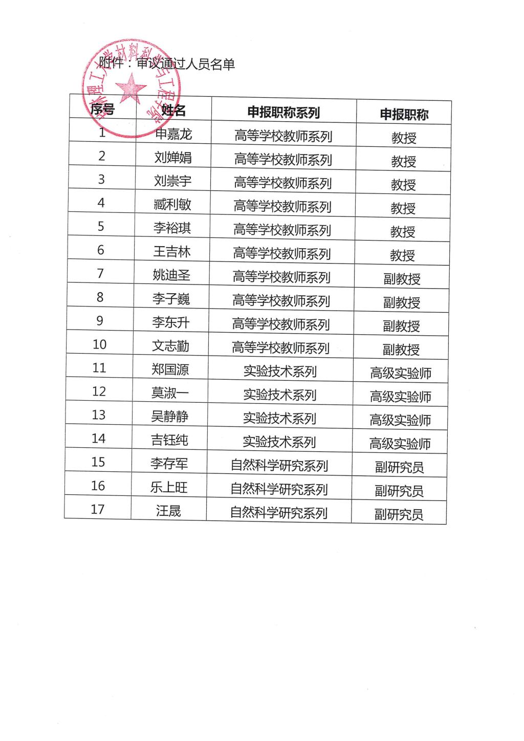 材料科学与工程学院2024年度职称审议推荐结果公示
