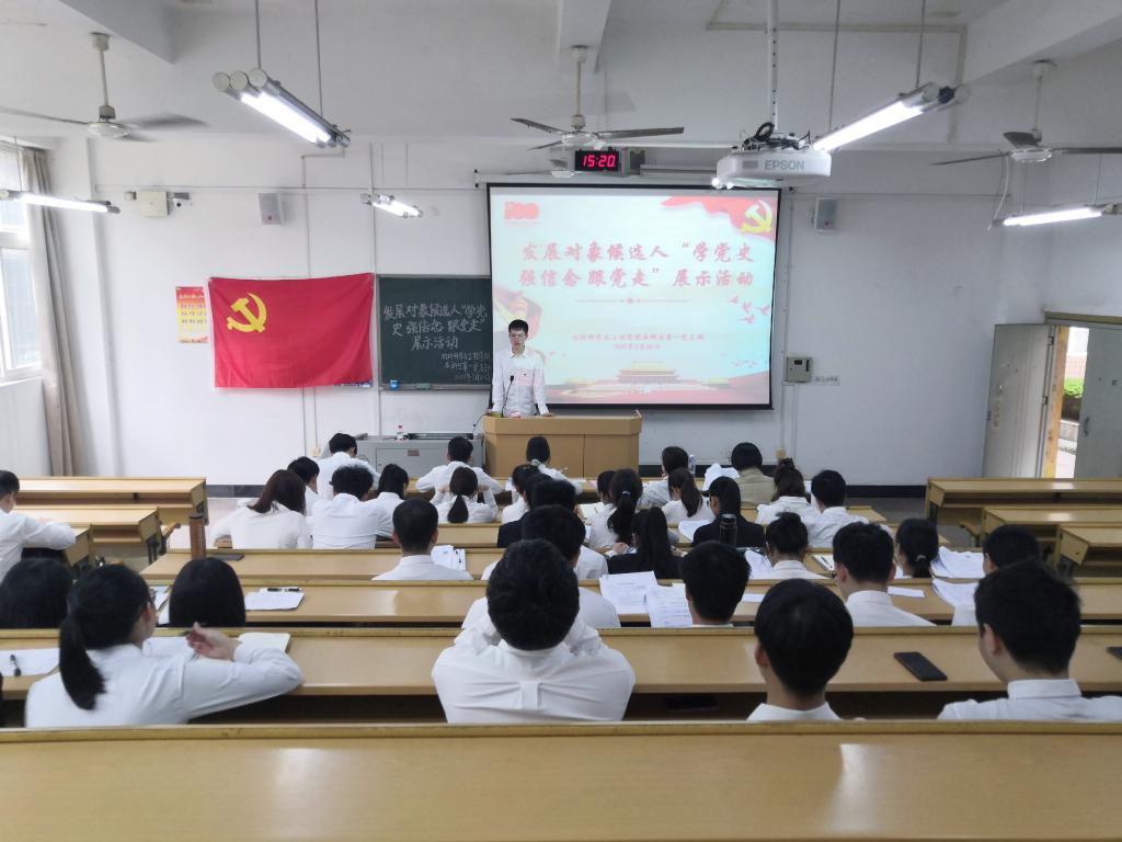 为积极响应党史学习教育的号召,引导发展对象候选人积极学习党史,提高思想认识,进一步端正入党动机,坚定理想信念,3月30日下午,学院本科生第一党支部组织开展发展对象候选人“学党史、强信念、跟党走”展示活动,支部全体党员参加了活动。