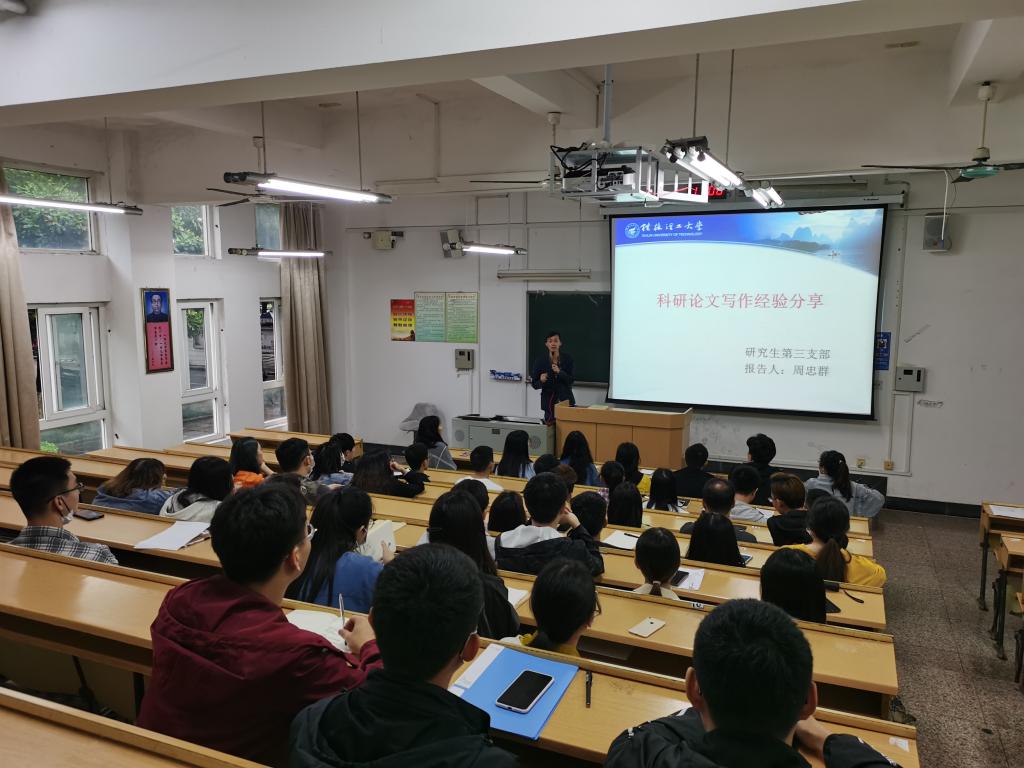 为贯彻落实“学史明理,学史增信,学史崇德,学史力行”的要求,2021年5月21日,研究生第三支部在9115教室举办了科研经验分享会,本次科研分享会由支部党员周忠群博士主讲,全体党员、积极分子以及群众参加此次分享会。