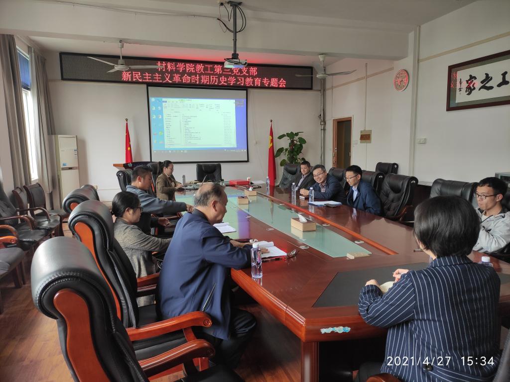 4月27日下午,学院教工三支部在2308会议室召开专题学习会,主题为结合我院高分子材料与工程专业实际情况,开展新民主主义革命时期历史专题学习活动,我院教工三支部全体教工党员均按时参加了此次学习。
