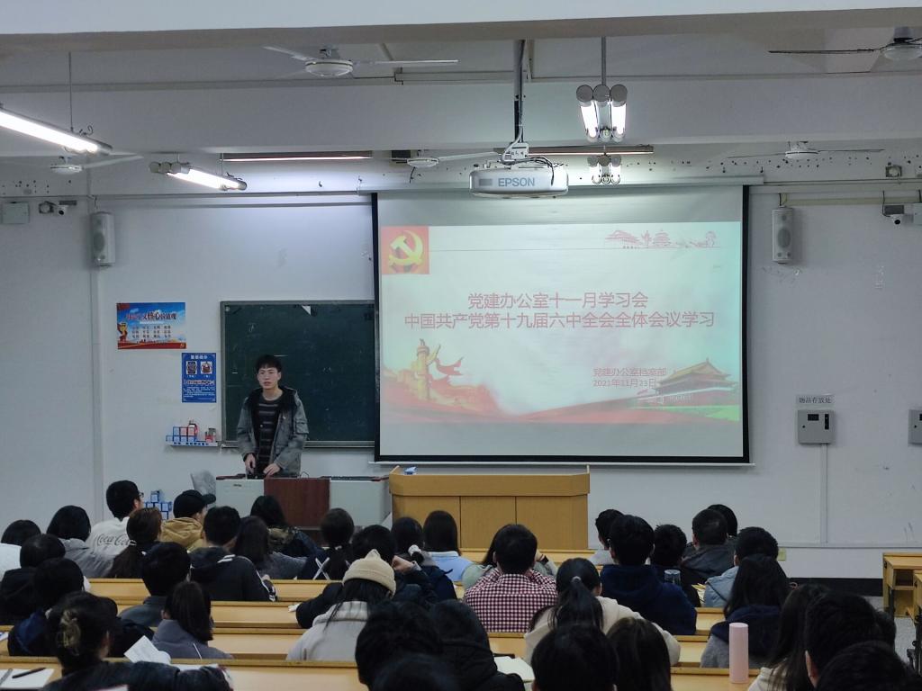 为深入学习贯彻党的十九届六中全会精神,了解党的百年奋斗重大成就、历史意义和历史经验,更加坚定自觉地践行初心使命。11月23日晚,学院组织全体党建办公室成员在9511教室学习党的十九届六中全会精神。