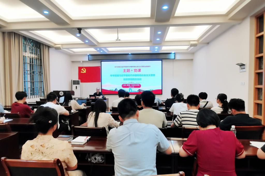 为深入学习贯彻习近平新时代中国特色社会主义思想和党的二十大精神加强和改进党的基层组织建设,全面提升基层党支部书记的能力素质和业务水平。2023年6月26日,材料科学与工程学院、商学院、土木与建筑工程学院联合分党校2023年春季学期基层党支部书记培训班在4204会议室开展。马克思主义学院副院长蒋晓俊同志作《牢牢把握习近平新时代中国特色社会主义思想的世界观和方法论》专题党课,屏风校区三个学院基层党支部书记及师生党员代表参加学习。