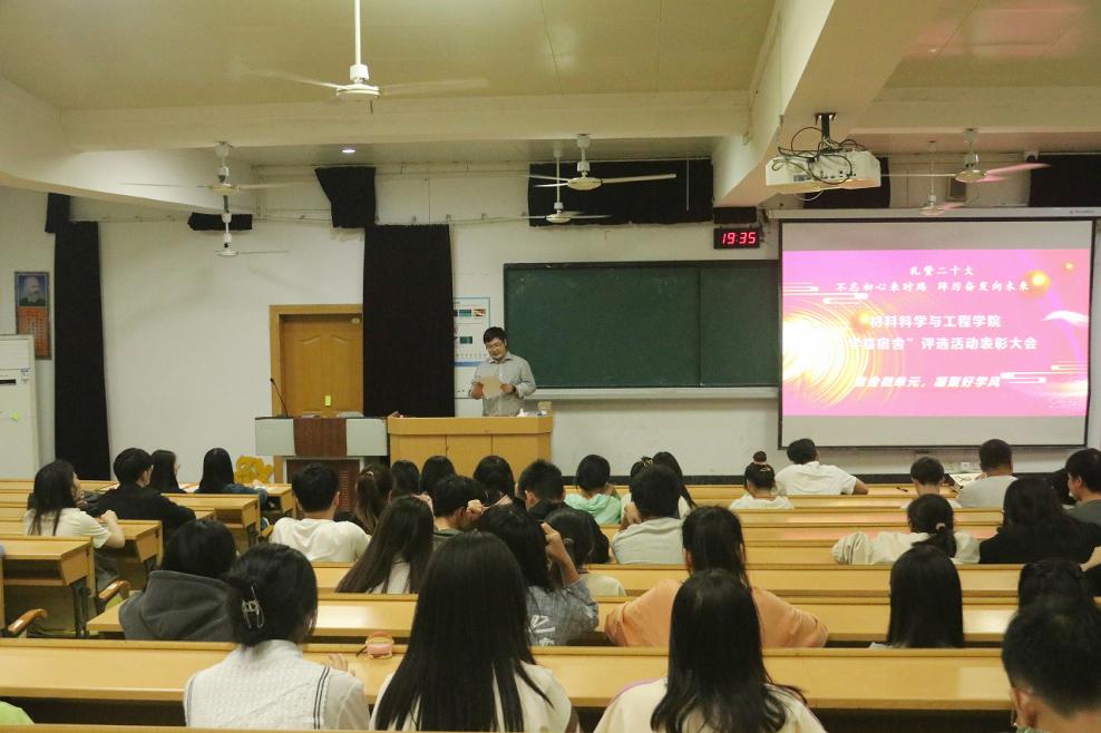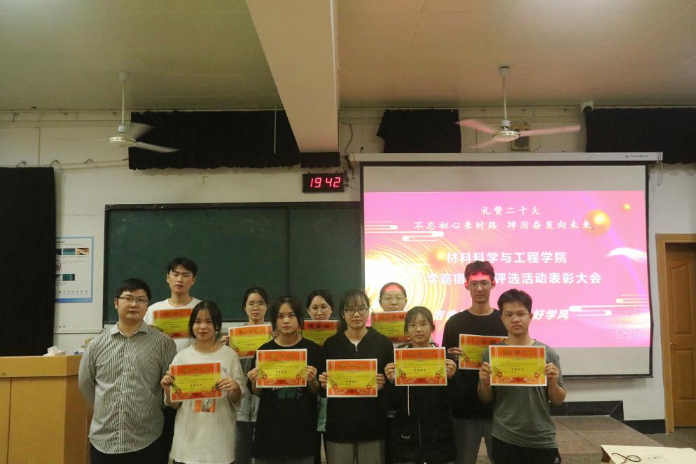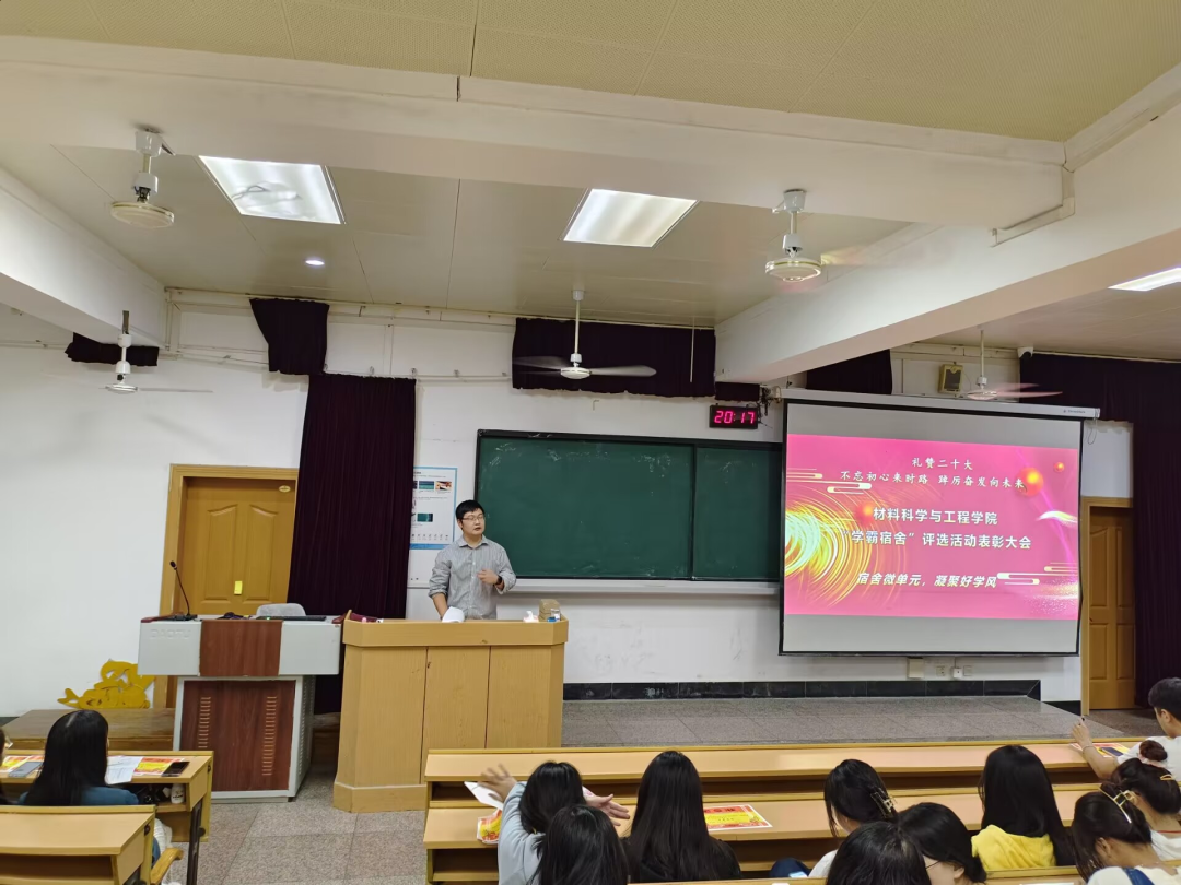 为推进我院优良学风建设,发挥榜样力量,以自律“舍风”带动优良“学风”,营造积极进取、勤奋好学的学习氛围,充分发挥宿舍育人功能。材料科学与工程学院特举办“宿舍微单元,凝聚好学风”为主题的“学霸宿舍”评选活动。本次活动共收到申请表46份,共评选出“学霸宿舍”22个,其中2019级4个,2020级8个,2021级10个。为表彰优秀、塑造榜样,学院在11月8日在屏风校区9101教室成功举办材料科学与工程学院2021-2022年度“学霸宿舍”表彰大会。本次大会共分4个环节,由2021级杨晴瑞同学主持。