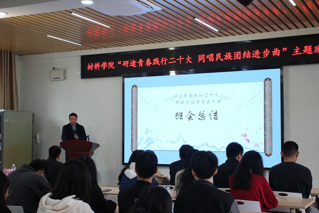 最后,王茗副院长充分肯定了本次会议并作总结发言。王茗副院长指出,本次主题班会形式创新、组织有力,极大提升了同学们的班级凝聚力和集体荣誉感,是学院研究生党班团一体化建设成果的重要体现。希望各位同学在本次班会的引领下,能够将眼光放长放远,关心关注国家社会需求,厚德笃学、惟实励新,不断提升智慧才干、增强本领,助推国家民族团结进步事业发展。