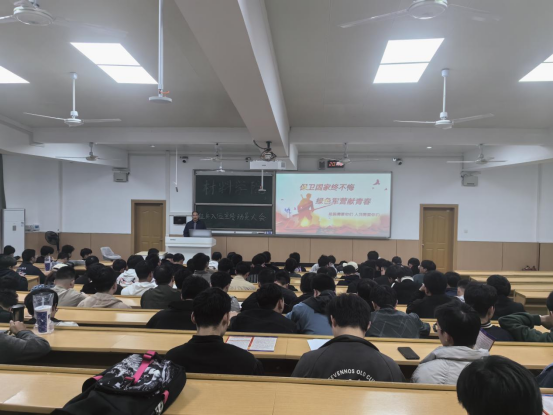会议伊始,武装部副部长黄海结合自身参军及工作经历为同学们介绍了当前的就业形势与大学生参军的积极意义,并从政治账、就业账、经济账等几个方面围绕大学生参军入伍的身体条件、可享受的优待待遇、资助办法、考研升学以及退役就业服务政策等多角度向同学们进行解读宣讲,帮助同学们对于征兵工作的要求、流程和2024年上半年征兵安排都有了更加深入的认识,结合应届毕业生的应征条件、报名流程、发展路径、经济优待政策等方面展开了细致的解读,黄海副部长指出:应征入伍是新时代青年大学生应尽的义务,更是光荣的使命,呼吁同学们积极响应国家号召,以投身军营的方式践行爱国心、报国志,为祖国国防建设贡献青春力量。