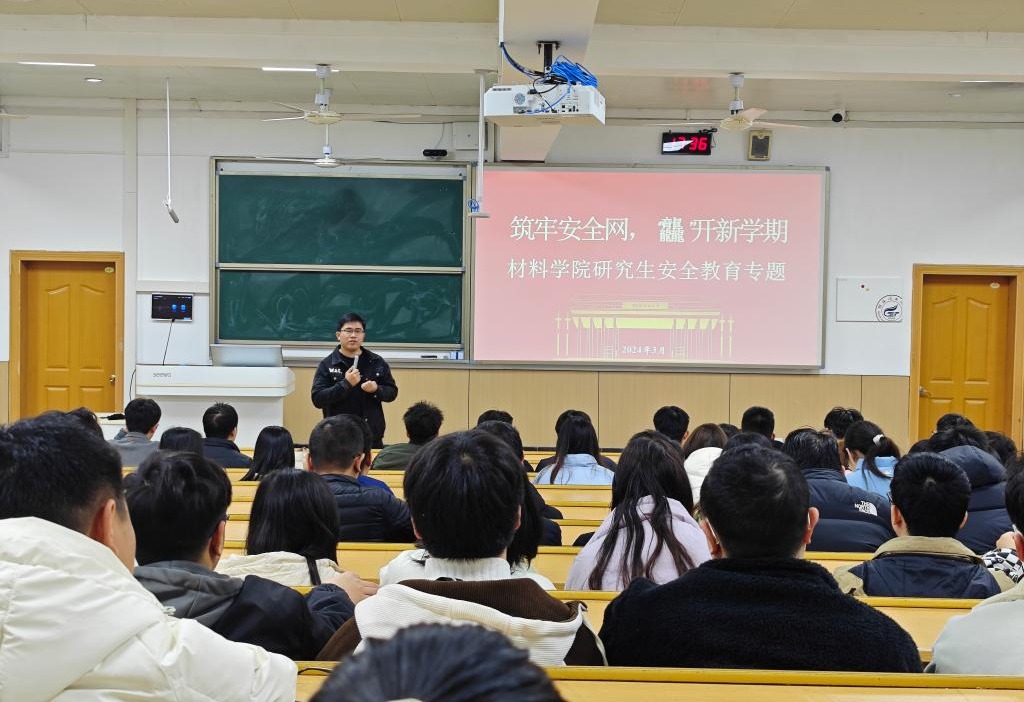 为使安全教育真正走进学生心中,增强学生自我保护意识,树立“生命第一,安全至上”理念。2024年3月3日,材料科学与工程学院组织召开新学期研究生安全教育大会,进一步增强研究生安全防范意识,保障校园安全。会议由各年级辅导员主持,学院全体研究生参加。