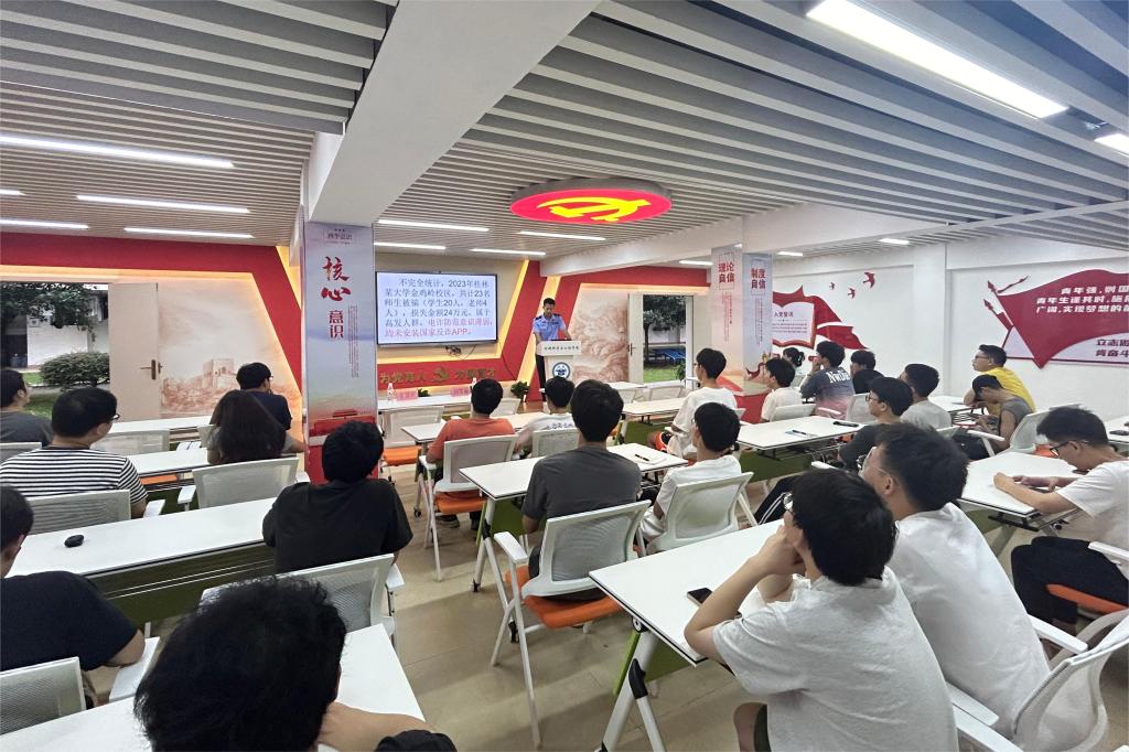 随后,来自桂林市公安局东江派出所的资深警官为学生们带来了一场生动详实的安全教育讲座。警官结合近年来发生在高校的各类安全事故案例,深入浅出地讲解了校园安全、交通安全、网络安全、防诈骗等多方面的安全知识。他通过鲜活的案例、详实的数据和专业的分析,让同学们深刻认识到安全问题的严重性和防范的必要性。