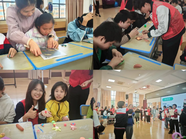 随后,一系列精心准备的互动体验活动陆续展开。在非遗蓝晒体验区,师生们耐心指导同学们创作,感受传统工艺的独特魅力;民族抛绣球活动中,手势与欢笑交织,协作乐趣横生;此外,捏泥巴、纸杯传乒乓球、造型气球制作等环节也气氛热烈。同学们用灿烂的笑容和灵动的眼神积极交流,现场暖意融融。我院学子以耐心的陪伴和细致的引导,真诚传递着对特殊同伴的尊重与关爱。