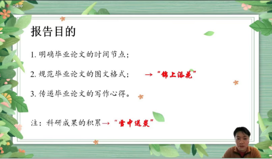 姚老师主要从“明确毕业论文的时间节点”、“规范毕业论文的图文格式”、“传递毕业论文的写作心得”三个方面进行讲述。姚老师引用去年“硕士年终论文送审及答辩的时间节点”作为开头,向同学们明确论文撰写的要点和注意事项。希望同学们端正学习态度,发挥主观能动性,强调“学生是自己学位论文质量的第一责任人”。要求学生对自己论文写作安排做出合理的时间规划,正视培养计划的毕业要求。随后姚老师从学位论文的封面、中英文摘要、目录、绪论、研究内容、结论与展望、参考文献等方面进行逐一讲解。