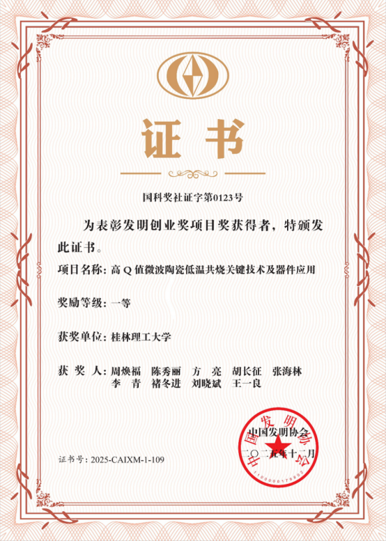 我院周焕福教授团队荣获2025年度中国发明协会“发明创业奖项目奖”一等奖近日,2025年度中国发明协会发明创业奖项目奖评选结果揭晓,我校材料科学与工程学院周焕福教授团队科技成果“高Q值微波陶瓷低温共烧关键技术及器件应用”荣获一等奖。周焕福教授团队针对我国在5G/6G移动通信、国防装备等领域长期面临的低温共烧陶瓷(LTCC)高端材料“卡脖子”难题,历经十余年攻关,成功构建了具有自主知识产权的低成本、高性能LTCC材料体系与器件制备技术。项目创新采用低介高Q微波陶瓷材料及其低温制备新技术...2025-12-23