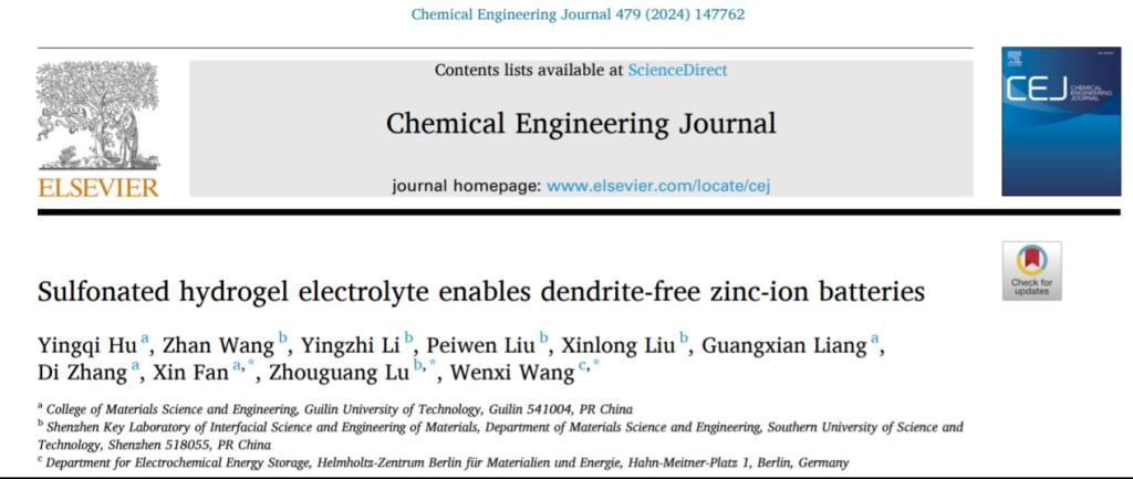 我院硕士研究生在国际权威刊物《Chemical Engineering Journal》发表文章近日,我院樊新教授课题组与南方科技大学卢周广教授和德国亥姆霍兹能源实验室王文浠博士合作,在水系锌离子电池储能领域取得重要研究进展,研究成果以“Sulfonated Hydrogel Electrolyte Enables Dendrite-free Zinc-ion Batteries”为题发表在国际权威期刊《Chemical Engineering Journal》上,该期刊影响因子为15.1,中科院SCI一区TOP。我校为第一作者单位,材料科学与工程学院硕士研究生胡颖奇为第一作者,樊新教授、卢...2023-12-11 -